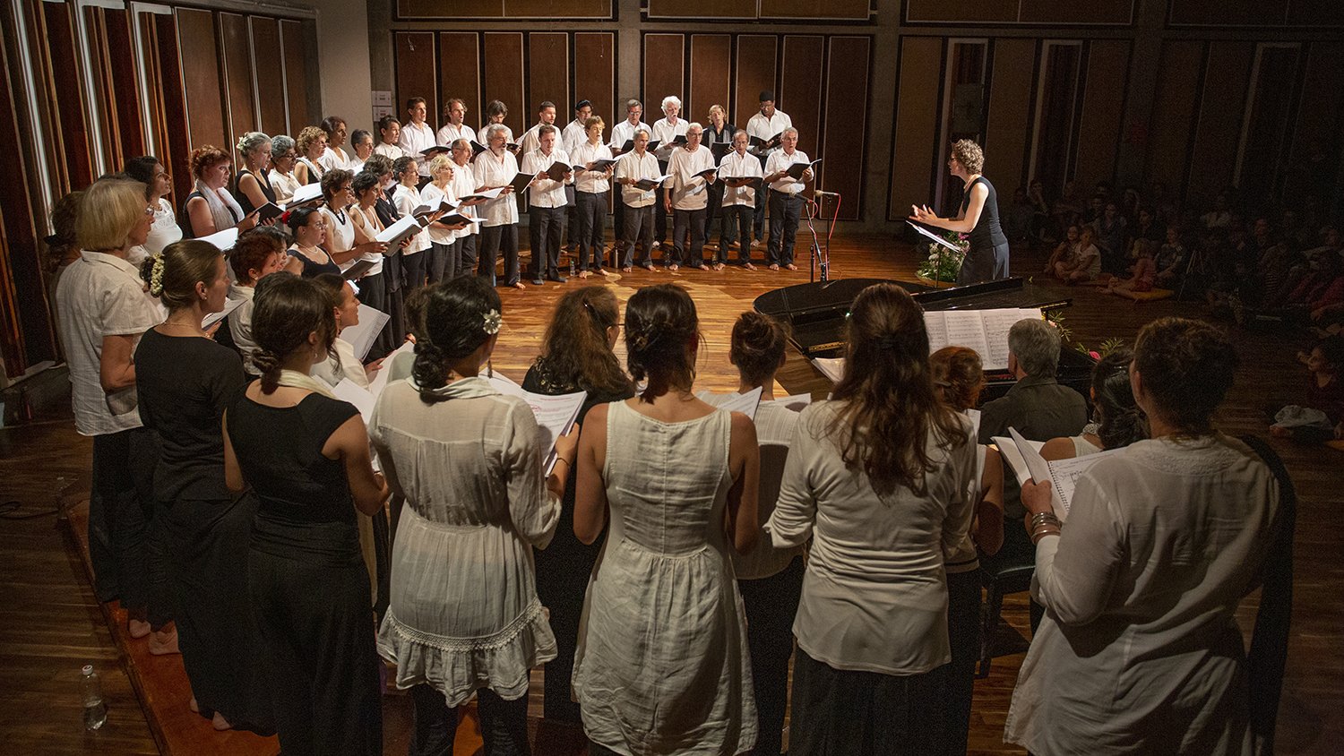 The central aim of the Auroville Choir is to promote human unity and to foster a more harmonious collectivity through the joy of singing together, while working to refine singing and develop musicality. In 1991 the choir was started and conducted by Pushkar Carlotto an aurovilian of Italian origin. From 1993 till date, it has been directed by Nuria Casanova, an aurovilian from Catalonia, Spain.